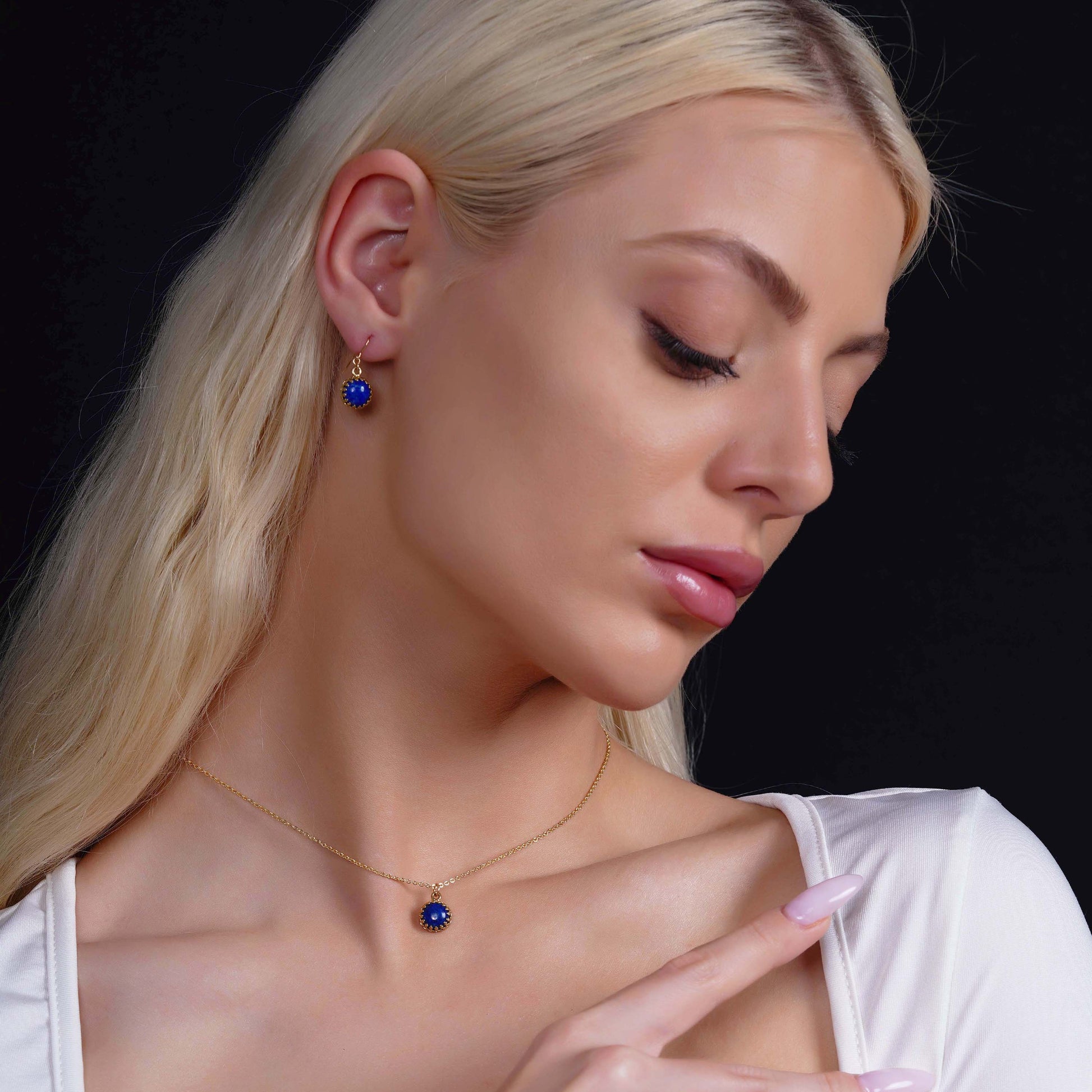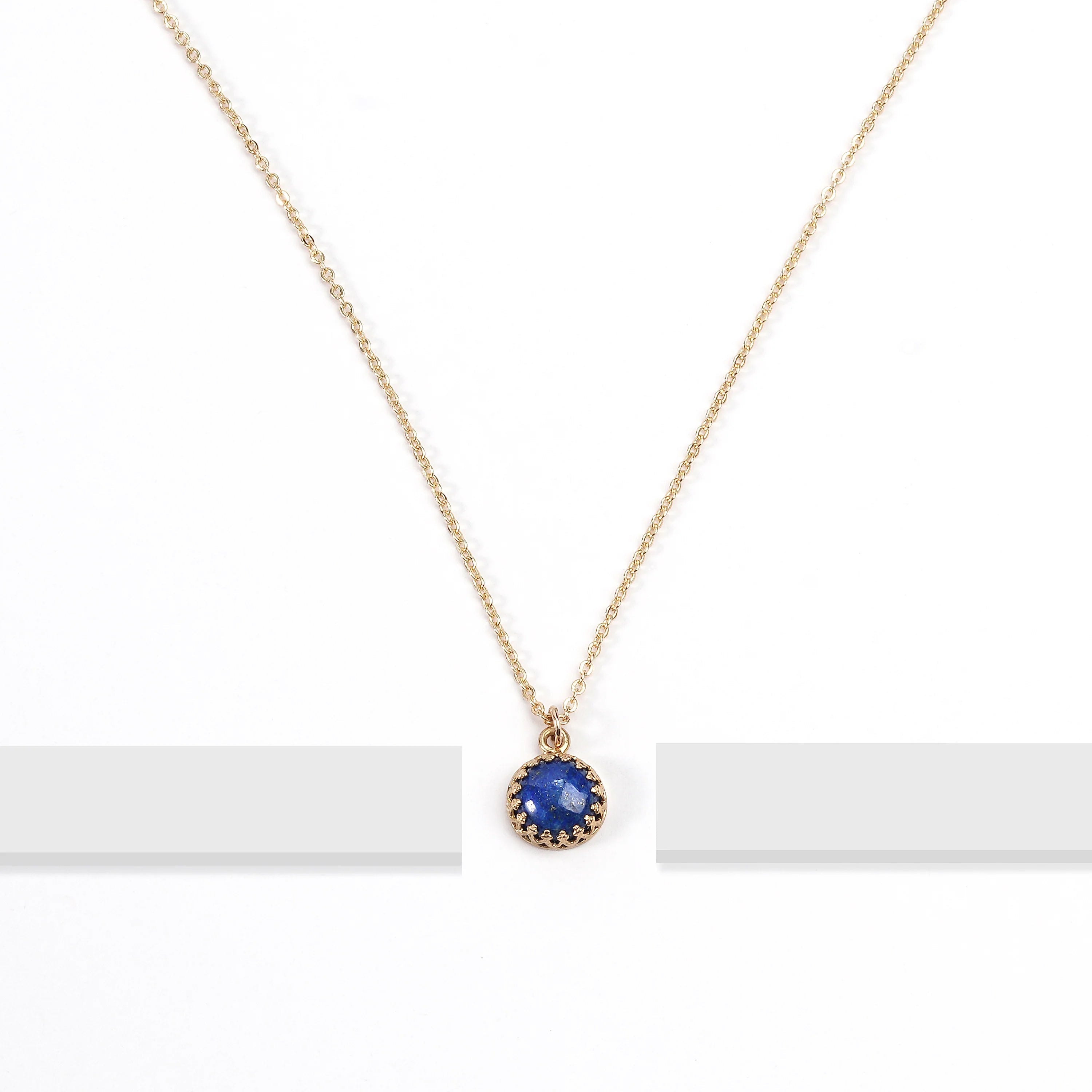 The Lapis Majesty Necklace showcases a round lapis lazuli gemstone encased in a delicately sculpted brass bezel, suspended on a fine 14 Karat Gold Filled (14KGF) chain. The celestial blue stone adds a rich, serene focal point, creating a piece that seamlessly transitions from day to night.