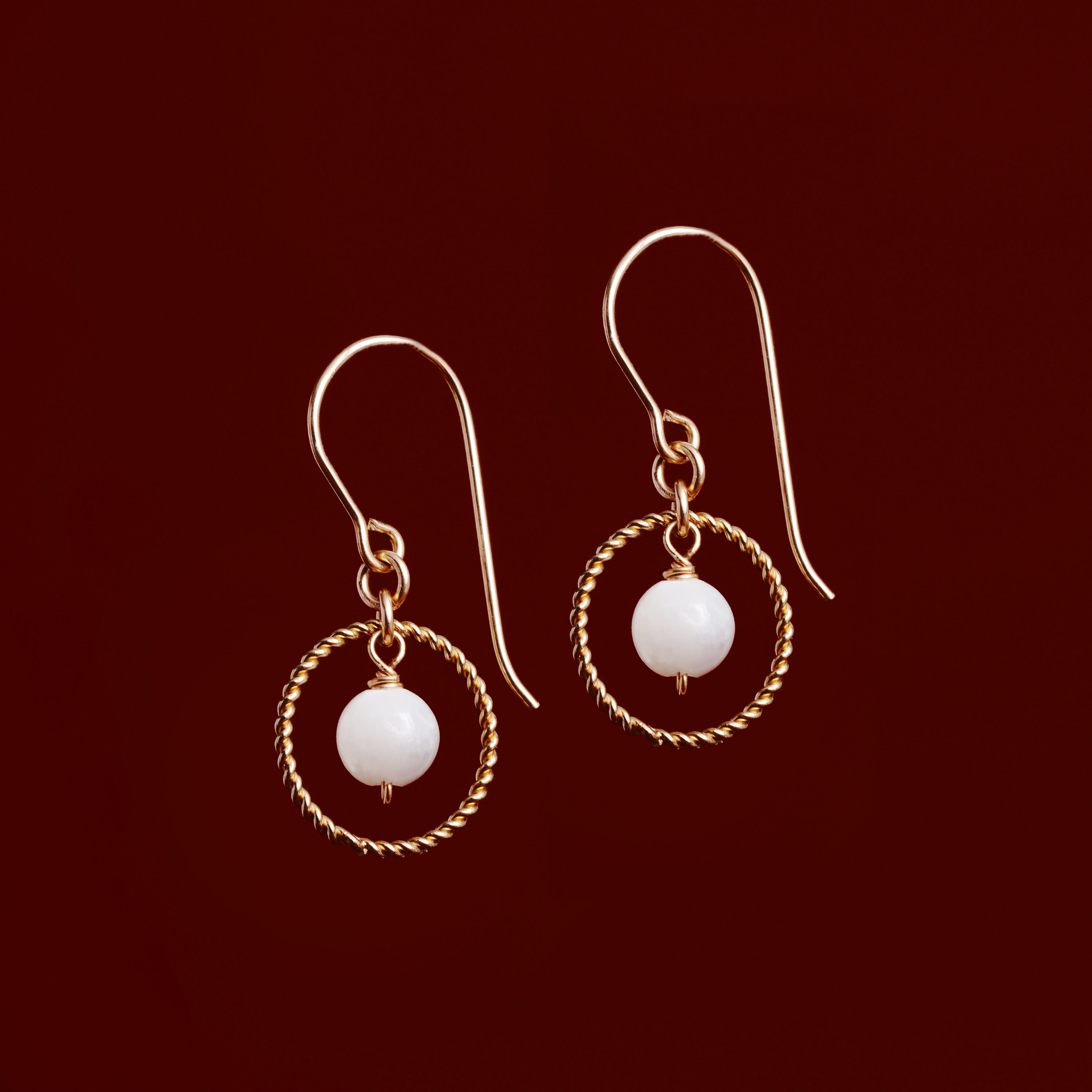 The dangle earrings are uniquely designed with textured gold-plated circles that echo gentle ripples in water. A single white Mother of Pearl bead sits delicately in the center of each hoop, offering a soft, ocean-inspired shimmer with every movement.