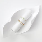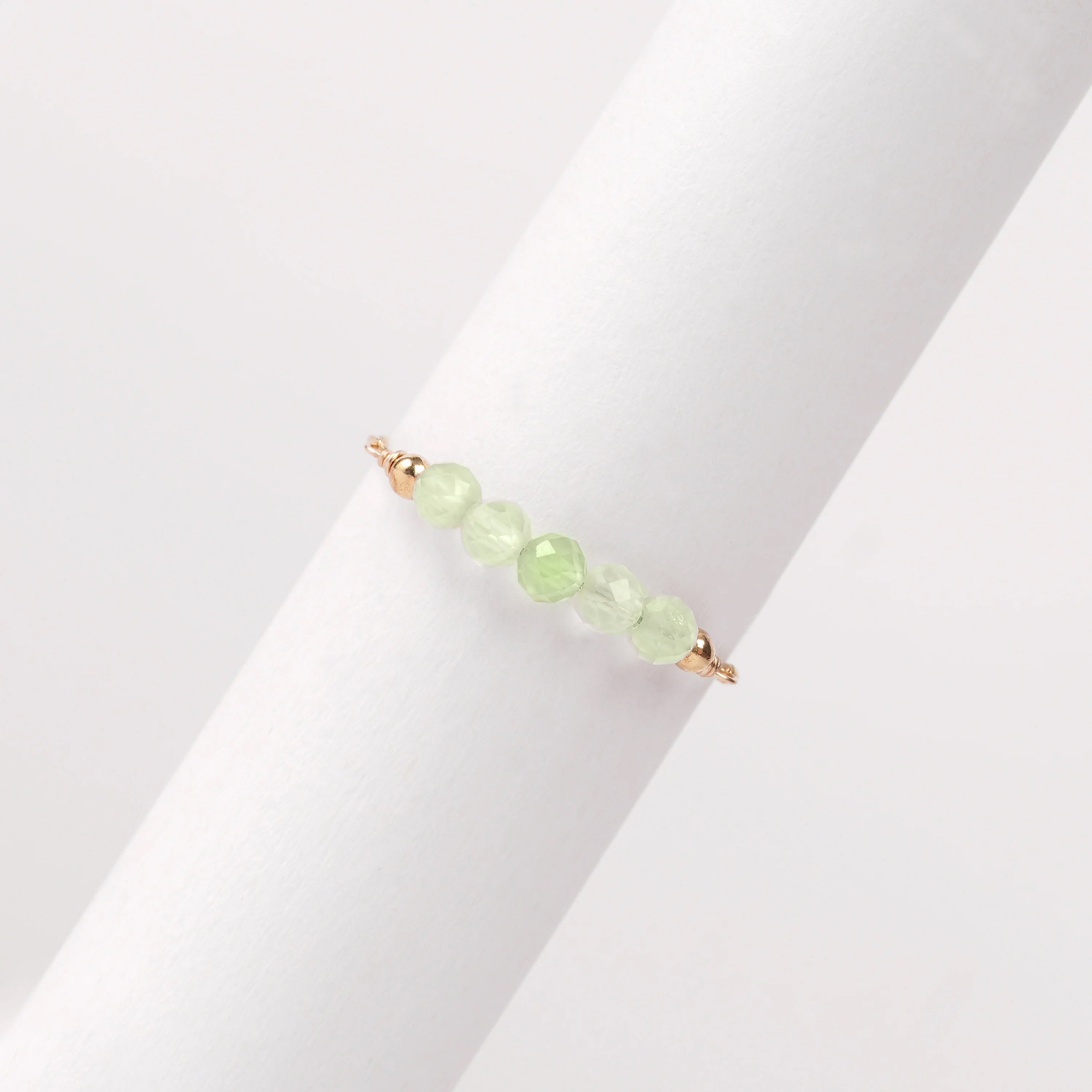 Adorn yourself with the serene elegance of the Lush Olive Ring, a handcrafted piece that celebrates the calming beauty of soft green tones. Made in Japan with refined detail, this ring features a delicate row of faceted prehnite beads strung on a 14 Karat Gold Filled (14KGF) chain. The gentle, translucent glow of the prehnite reflects nature’s quiet serenity, offering a harmonious balance of simplicity and sophistication.