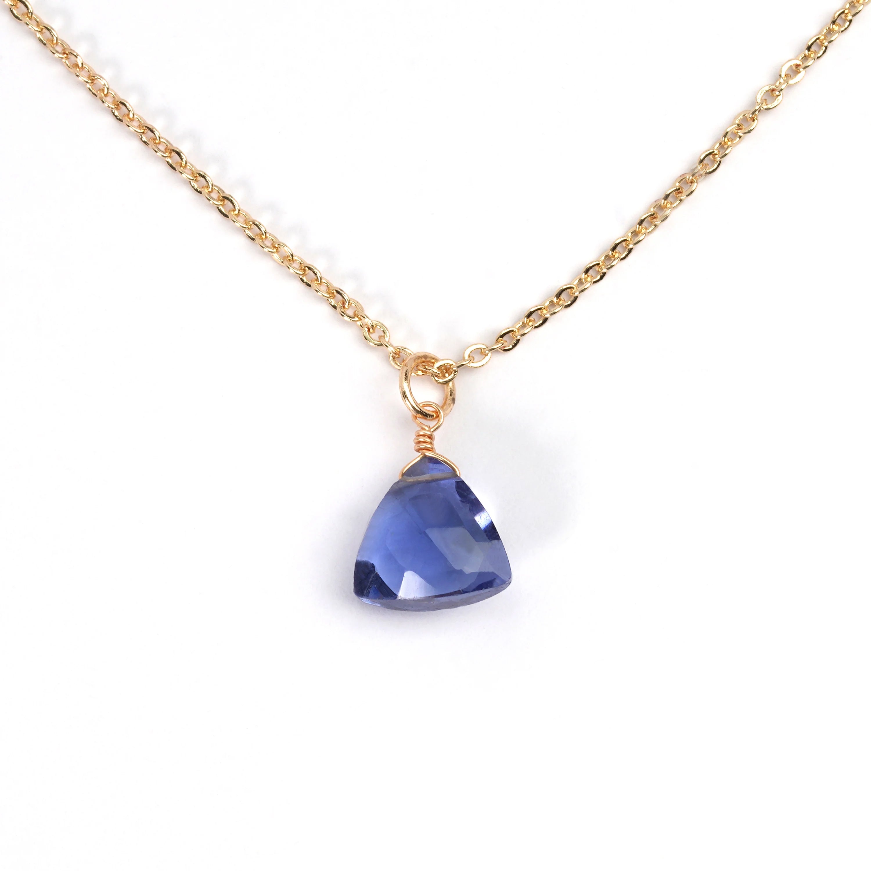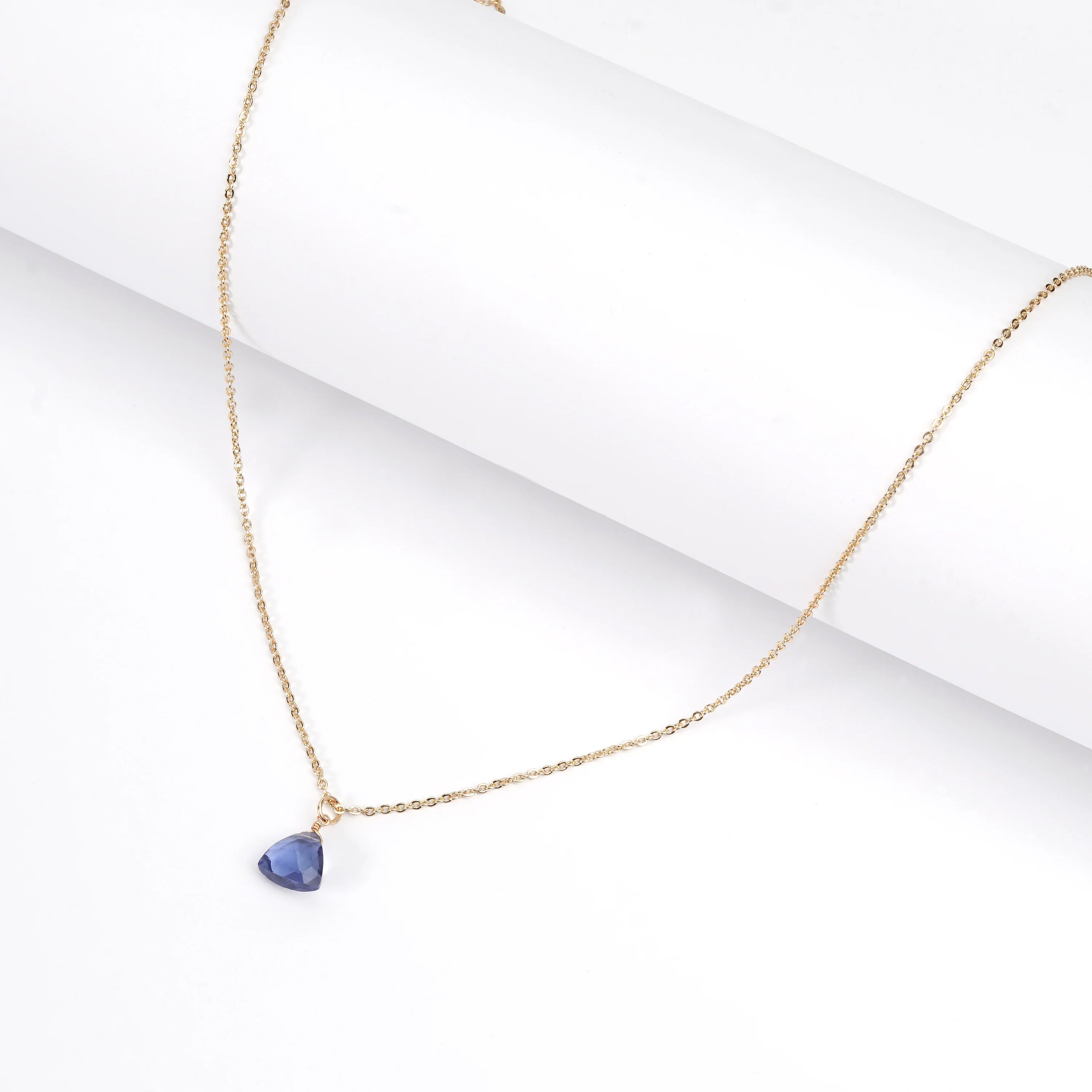 This elegant necklace features a finely crafted arrangement of tanzanite blue quartz gemstones on a delicate 14 Karat Gold Filled (14KGF) chain. At the center, a smooth triangular quartz pendant becomes the focal point, radiating a serene glow reminiscent of calm seas. The necklace is finished with a dainty 5 cm extender chain, adorned with a matching round quartz bead for subtle balance and graceful detail. Lightweight and comfortable, the design offers a versatile 40+5 cm length that flatters a variety of necklines.