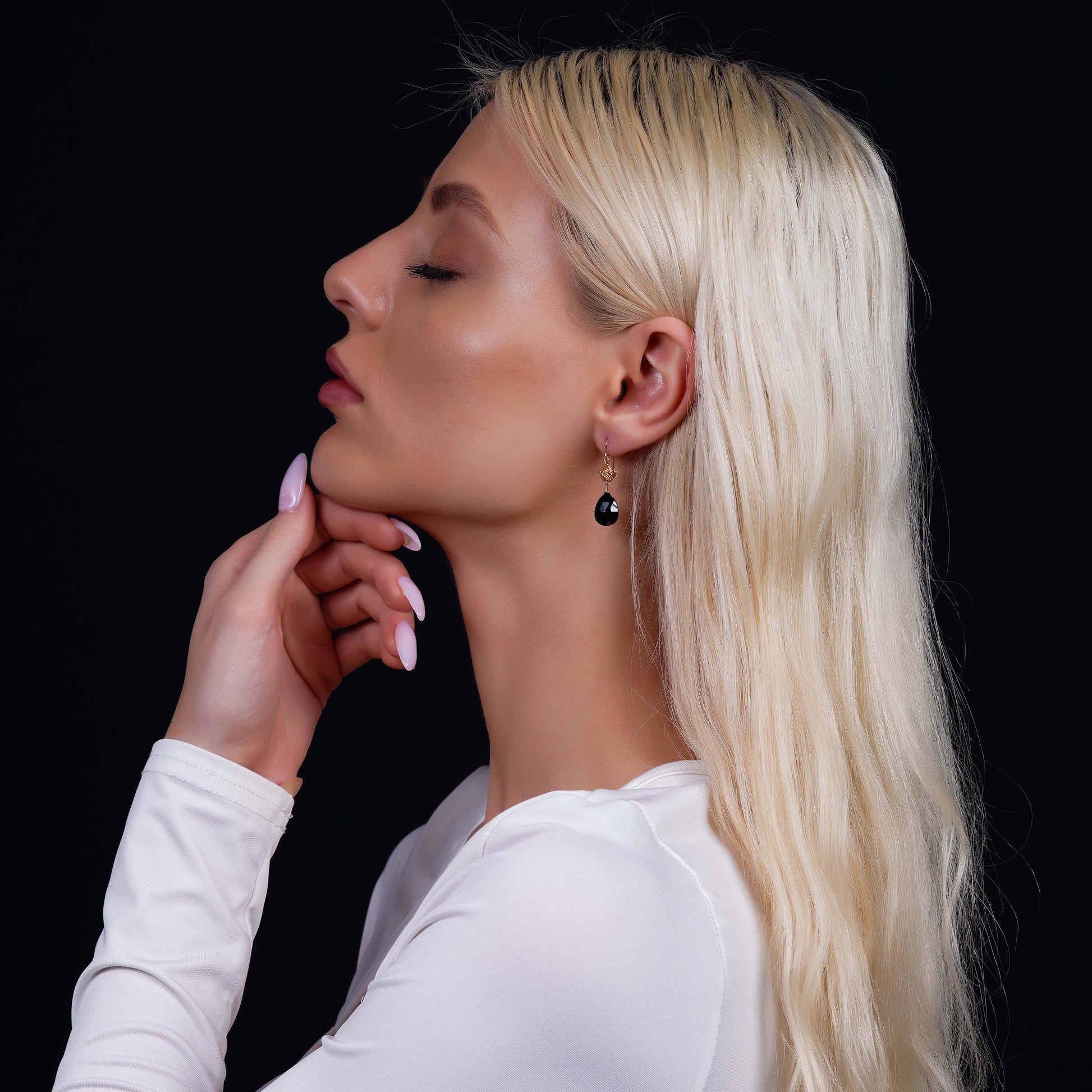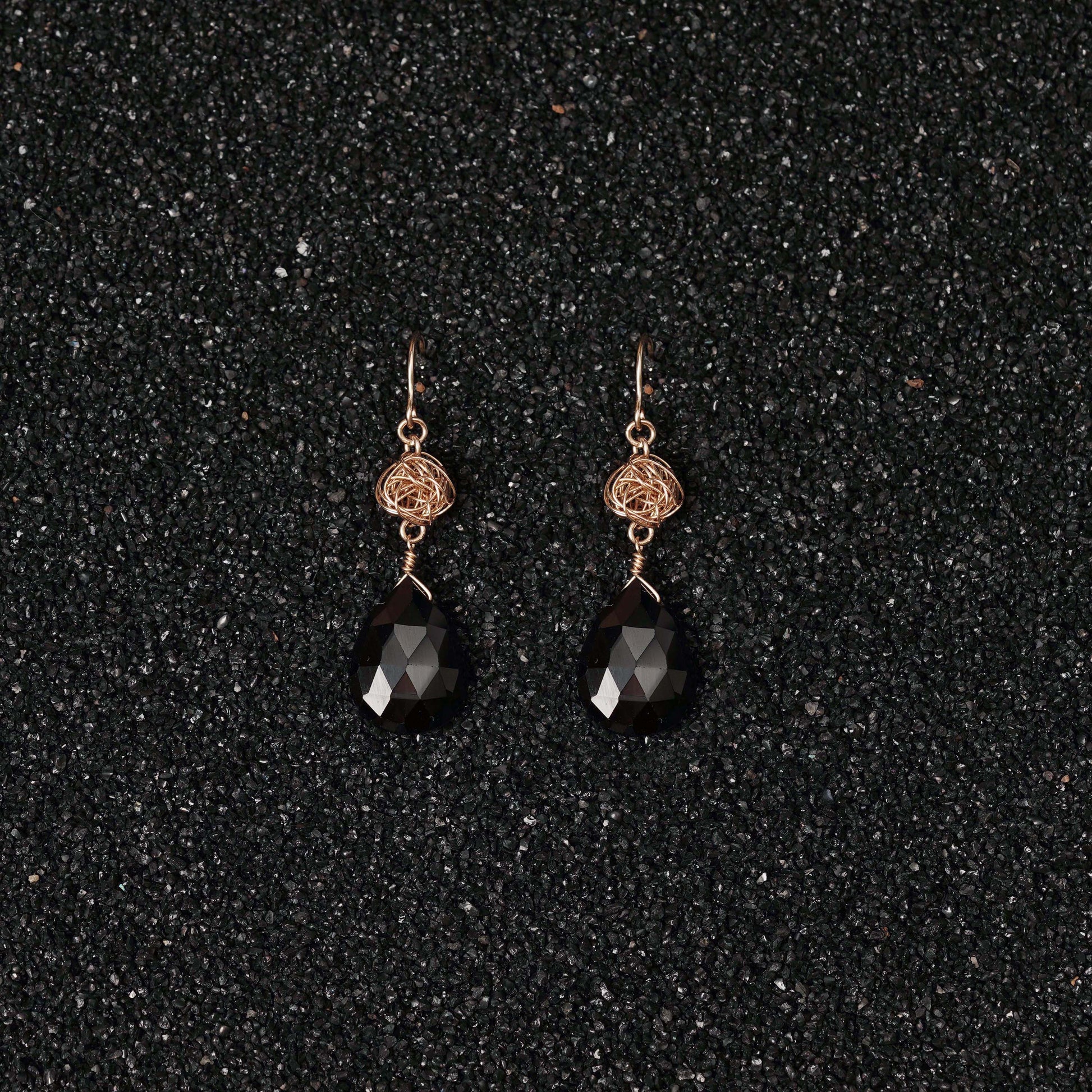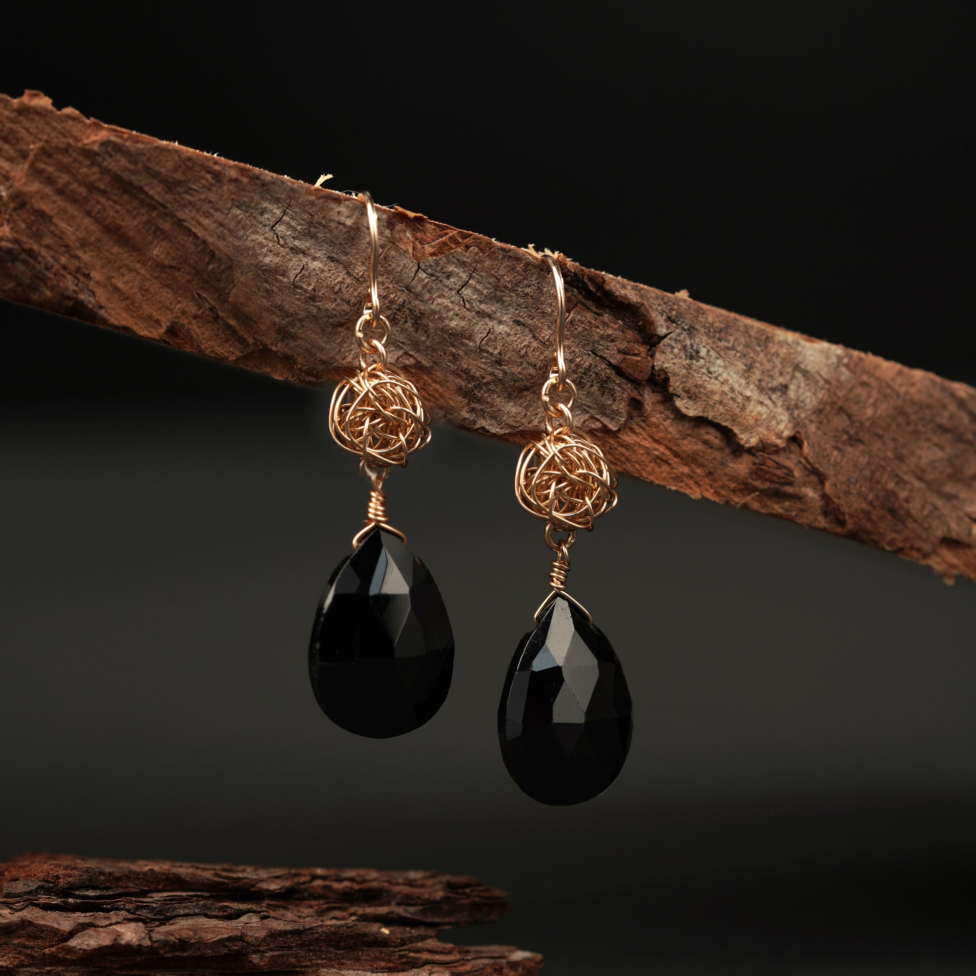 Twilight Twirl Earrings – Handcrafted 14KGF with Black Spinel Teardrops | Elegant Wire-Wrapped Dangles | Made in Japan